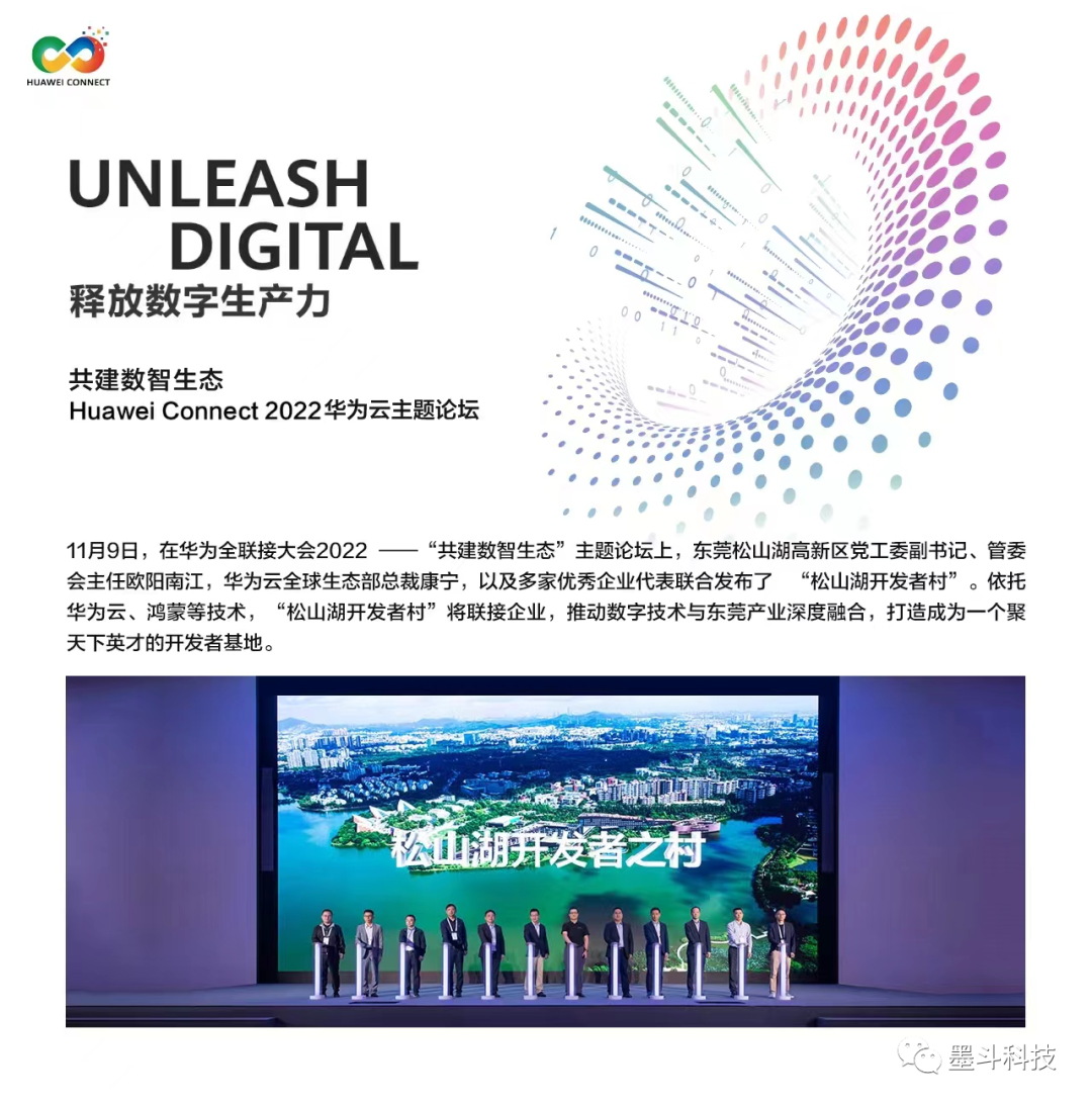 11月9日,在华为全联接大会2022“共建数智生态”主题论坛上,东莞松山湖党工委副书记、管委会主任欧阳南江,华为云全球生态部总裁康宁,墨斗科技受邀联合发布“松山湖开发者村”。依托华为云、鸿蒙等技术,“松山湖开发者村”将联接企业,打造成为一个聚天下英才的开发者基地。